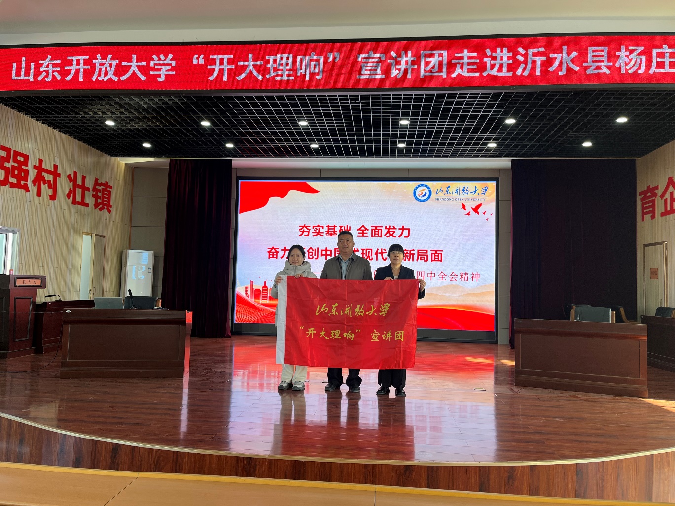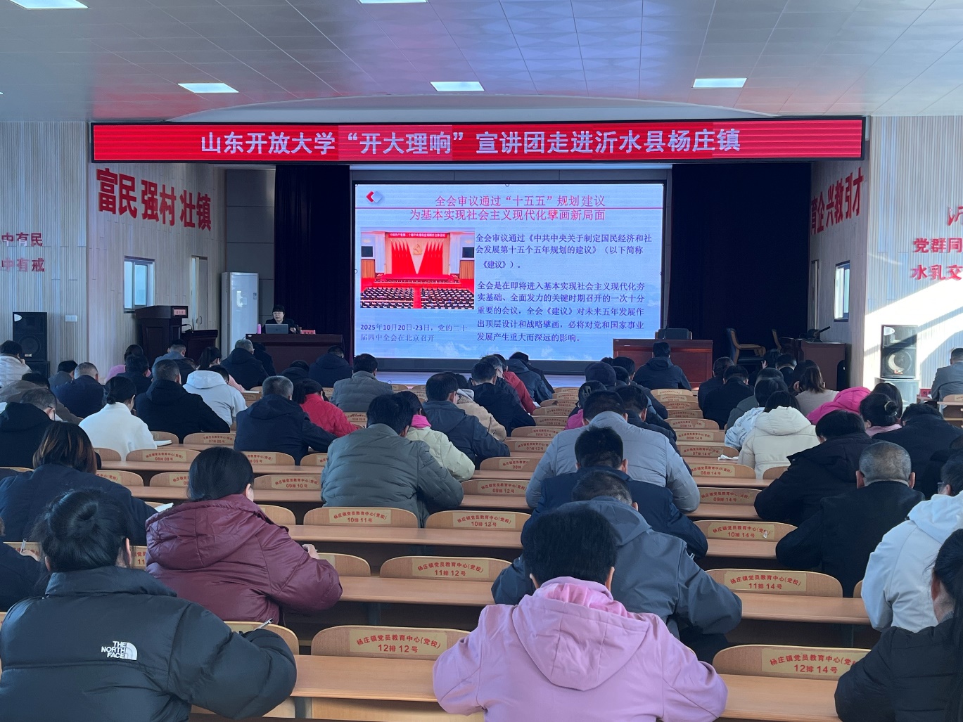 11月27日,学校“开大理响”宣讲团走进沂水县杨庄镇,开展党的二十届四中全会精神宣讲活动。学校党委委员、宣传部部长刘忠强,杨庄镇党委副书记、镇长庞京华,学校第一书记工作组参加活动。